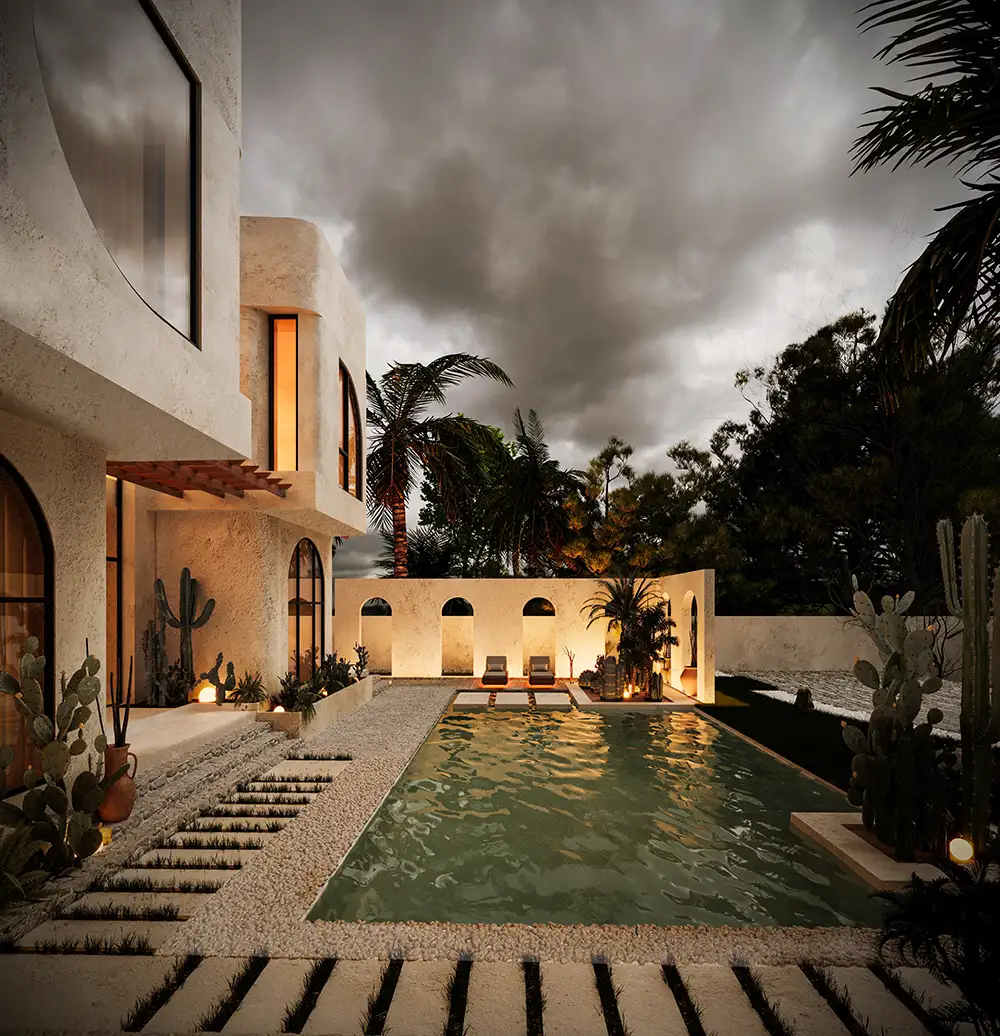 The architecture showcases Mediterranean-inspired elements with a prominent arch, textured walls, and natural materials. The cozy seating area under warm lighting fosters an intimate, relaxed outdoor atmosphere, seamlessly connected to the pool. The open layout enhances the sense of serenity and retreat.
