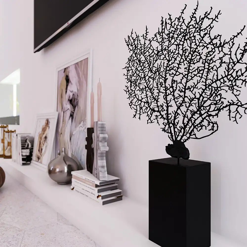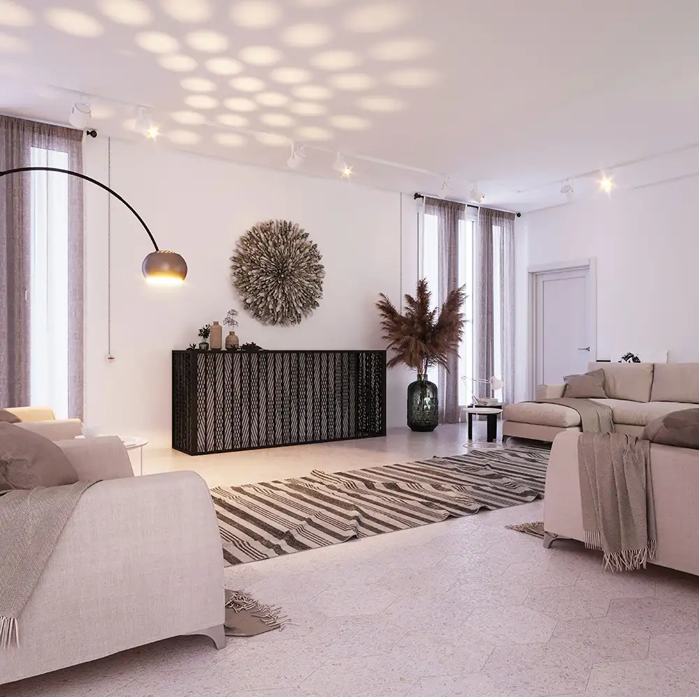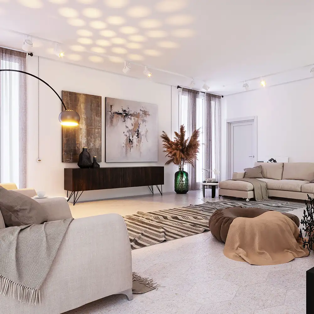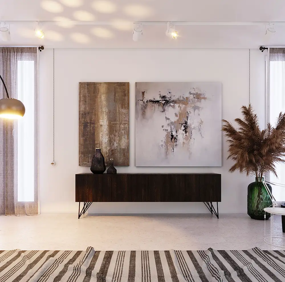 This living space embraces minimalism, featuring neutral tones and textured materials. Modern furniture pairs with artistic wall pieces and soft lighting to create a warm, inviting atmosphere. Natural decor elements, like pampas grass, enhance the relaxed, organic vibe.