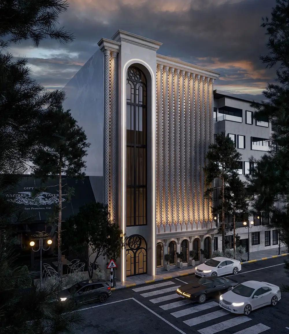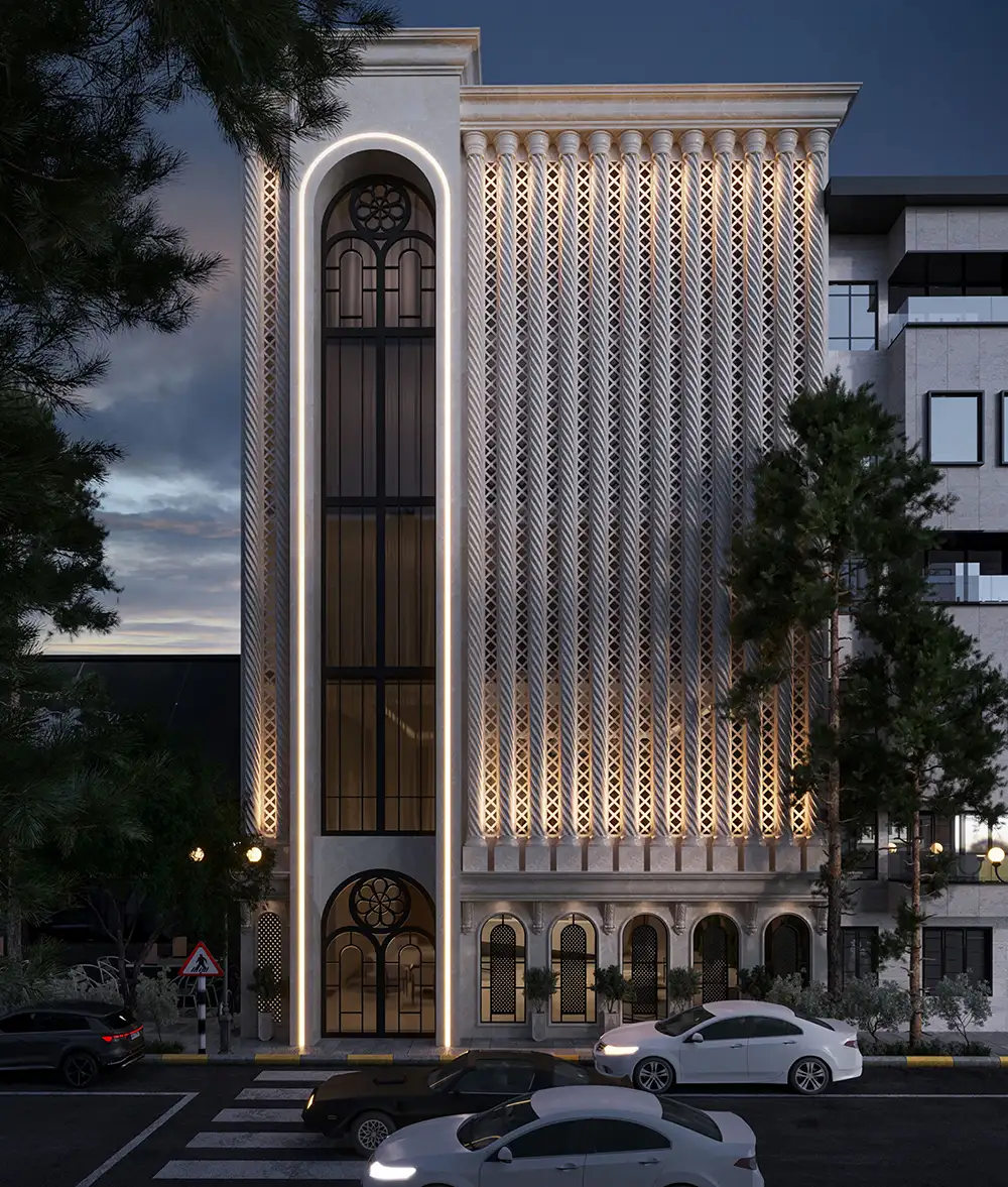 This building combines classical and modern architectural elements. The façade features intricate latticework and vertical columns, blending traditional elegance with contemporary minimalism. The grand arched window emphasizes verticality, creating a sense of height and refinement.